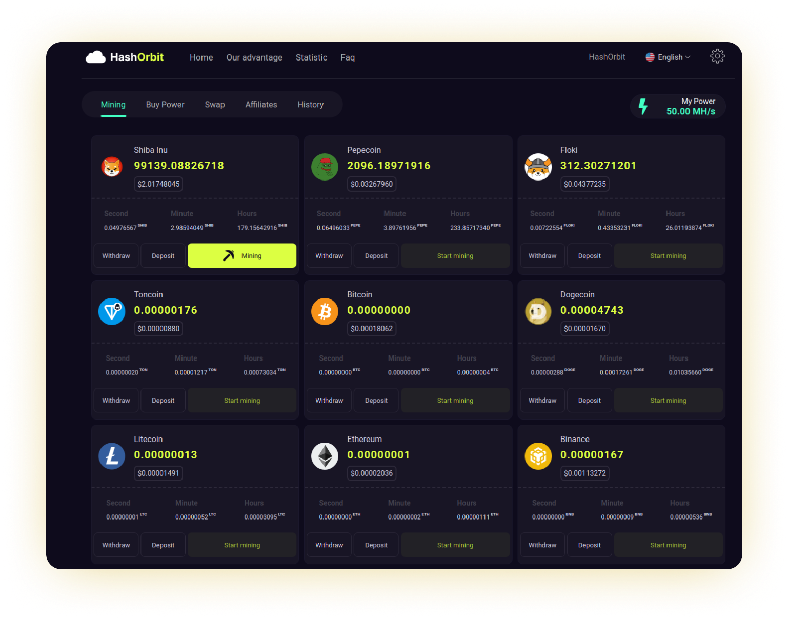 At HashOrbit, we provide cutting-edge cloud mining solutions that offer security, profitability, and ease of use. Start mining cryptocurrencies like BTC, ETH, DOGE, LTC, TRX, USDT, SHIB, BNB, PEPE, FLOKI, TON, TRUMP, SOL, BONK today and experience continuous daily payouts. Get Started Now